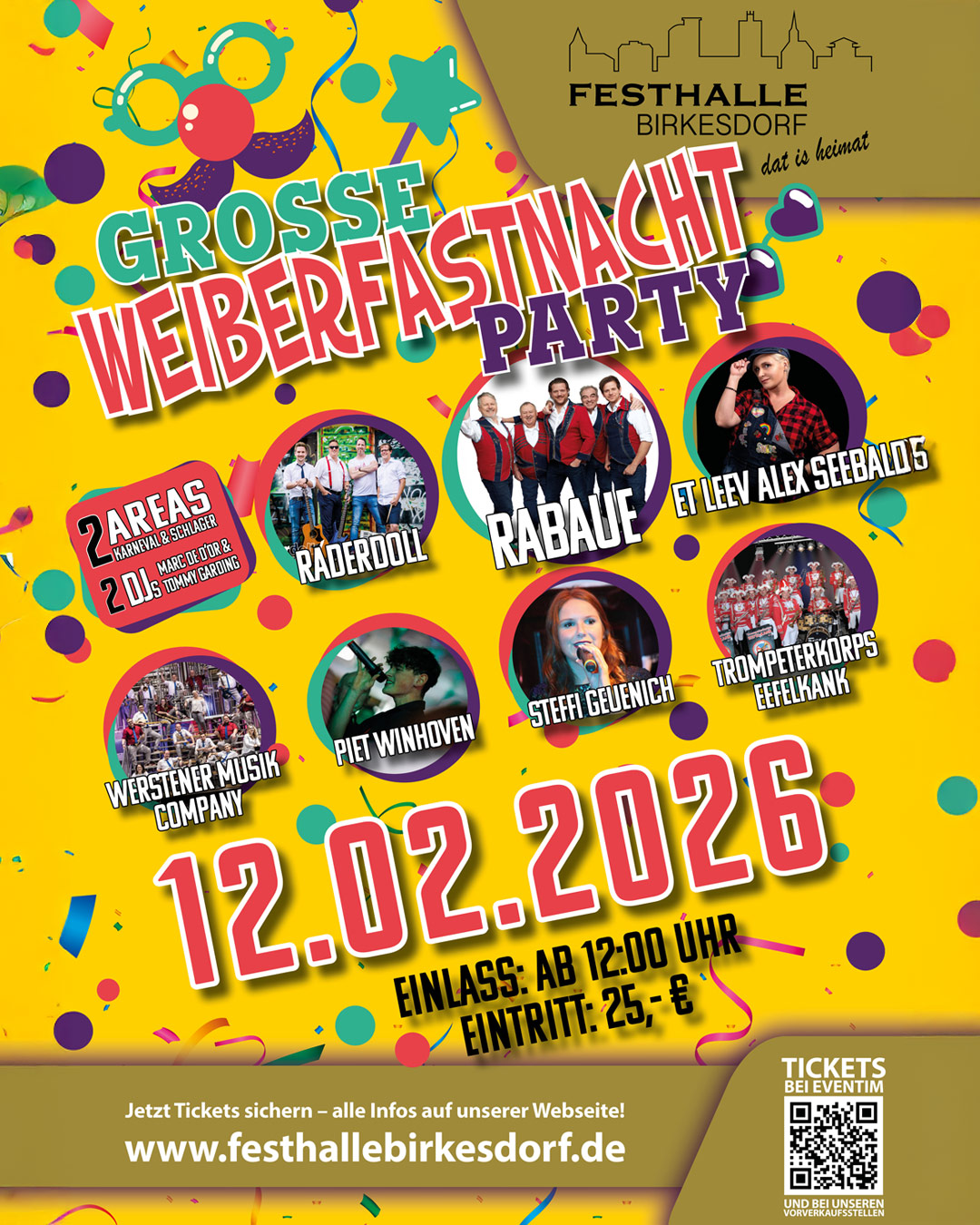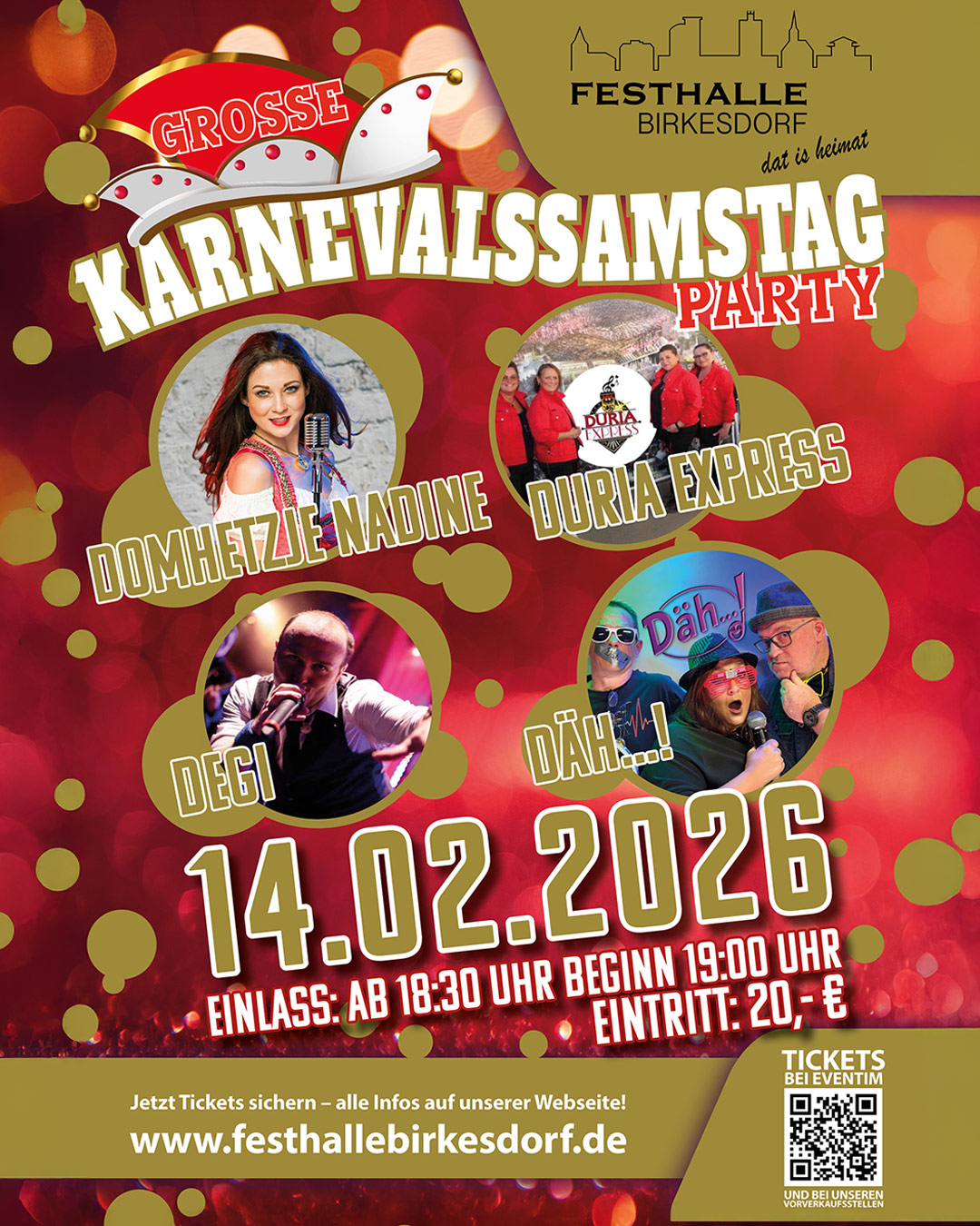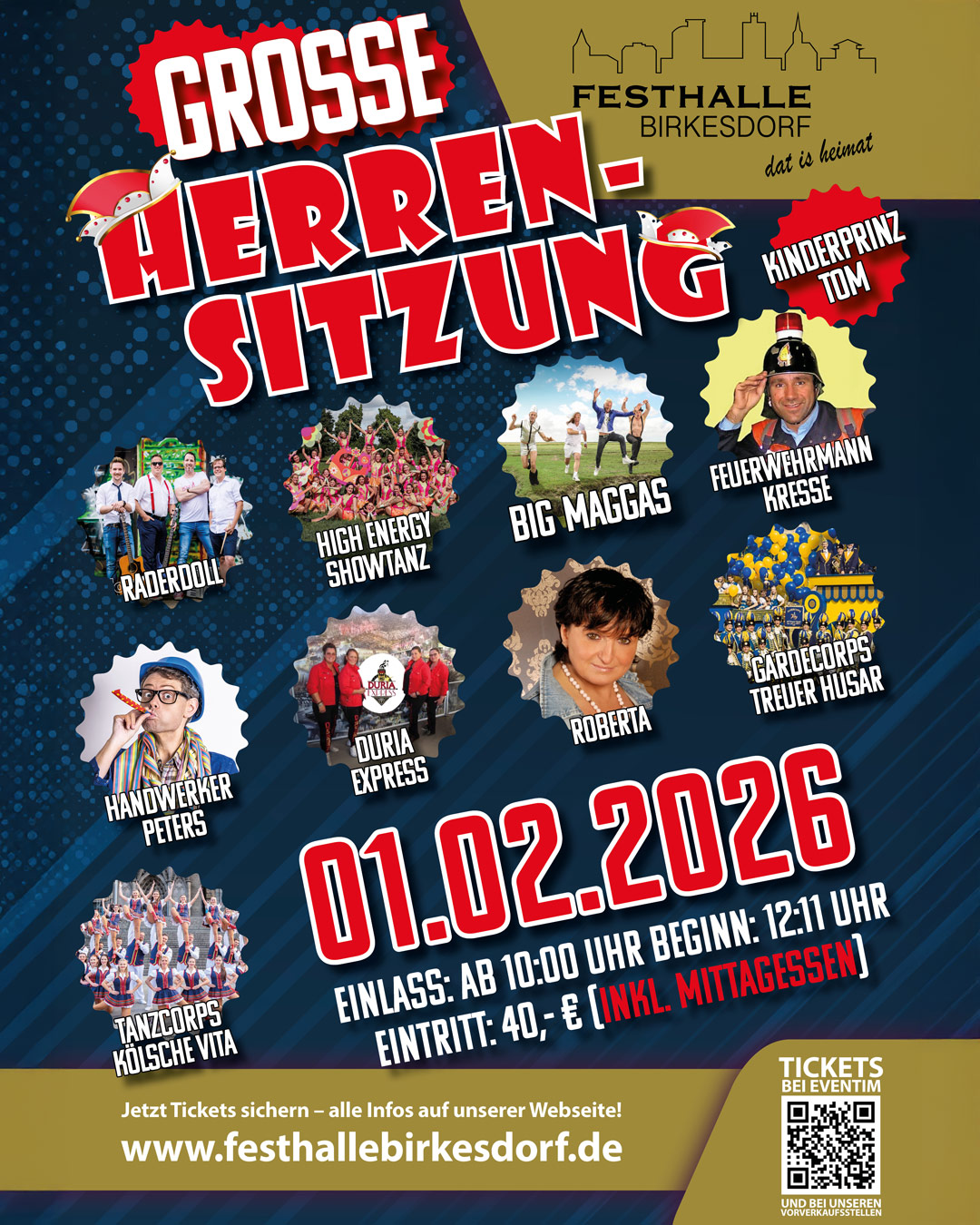 Große Herren-SitzungMittwoch, 01.02.2026Einlass: 10:00 UhrBeginn: 12:11 Uhr Eintritt: 40,-€ Download DownloadGroßeWeiberfastnacht PartyDonnerstag, 12.02.2026Einlass: ab 12:00 Uhr Eintritt: 25,- €2 Areas: Karneval & Schlager2 DJs: Marc de d'Or & Tommy GardingMit:Rabaue, et leev Alex Seebald 5,Werstener Musik Company, Piet Winhoven,Steffi Geuenich, Trompeterkorps Eefelkank GroßeKarnevalssamstag PartySamstag, 14.02.2026Einlass: ab 18:30 UhrBeginn: 19:00 Uhr Eintritt: 20,- €Mit: Domhetzje Nadine, Duria Express,Degi, Däh...! DownloadUnsere Verkaufsstellen in Düren und BirkesdorfFesthalle BirkesdorfAn der Festhalle 352353 DürenTel. 02421/9527372Rainer´s FrisiereckeRingstraße 352353 BirkesdorfTel. 02421/82907Tabak RichterParadiesplatz 1 (Tivolistraße)52349 DürenTel. 02421/43279
