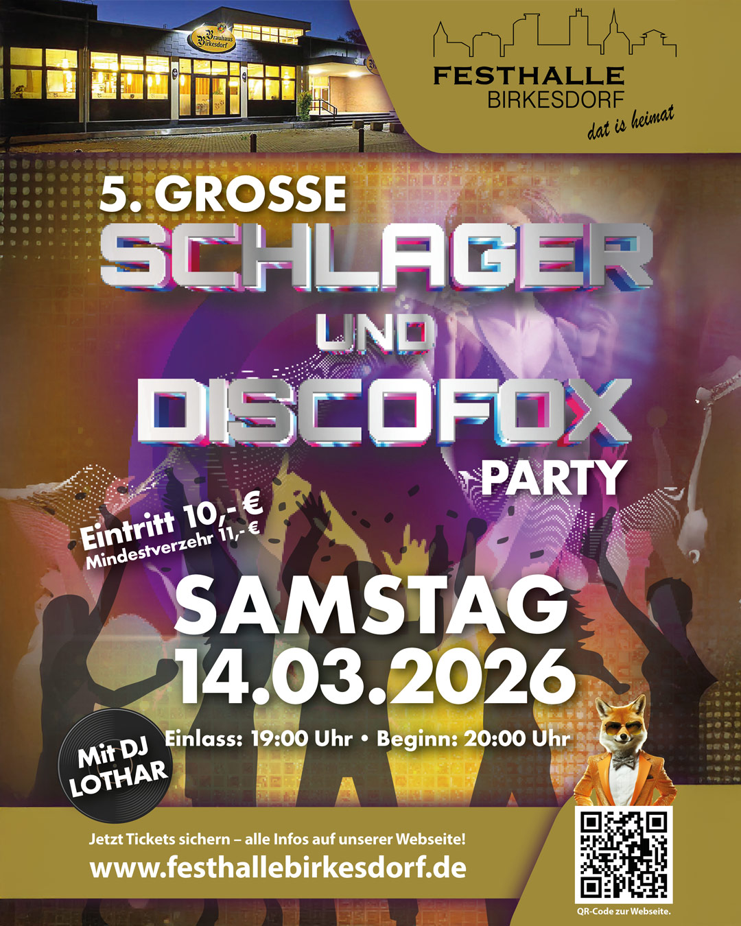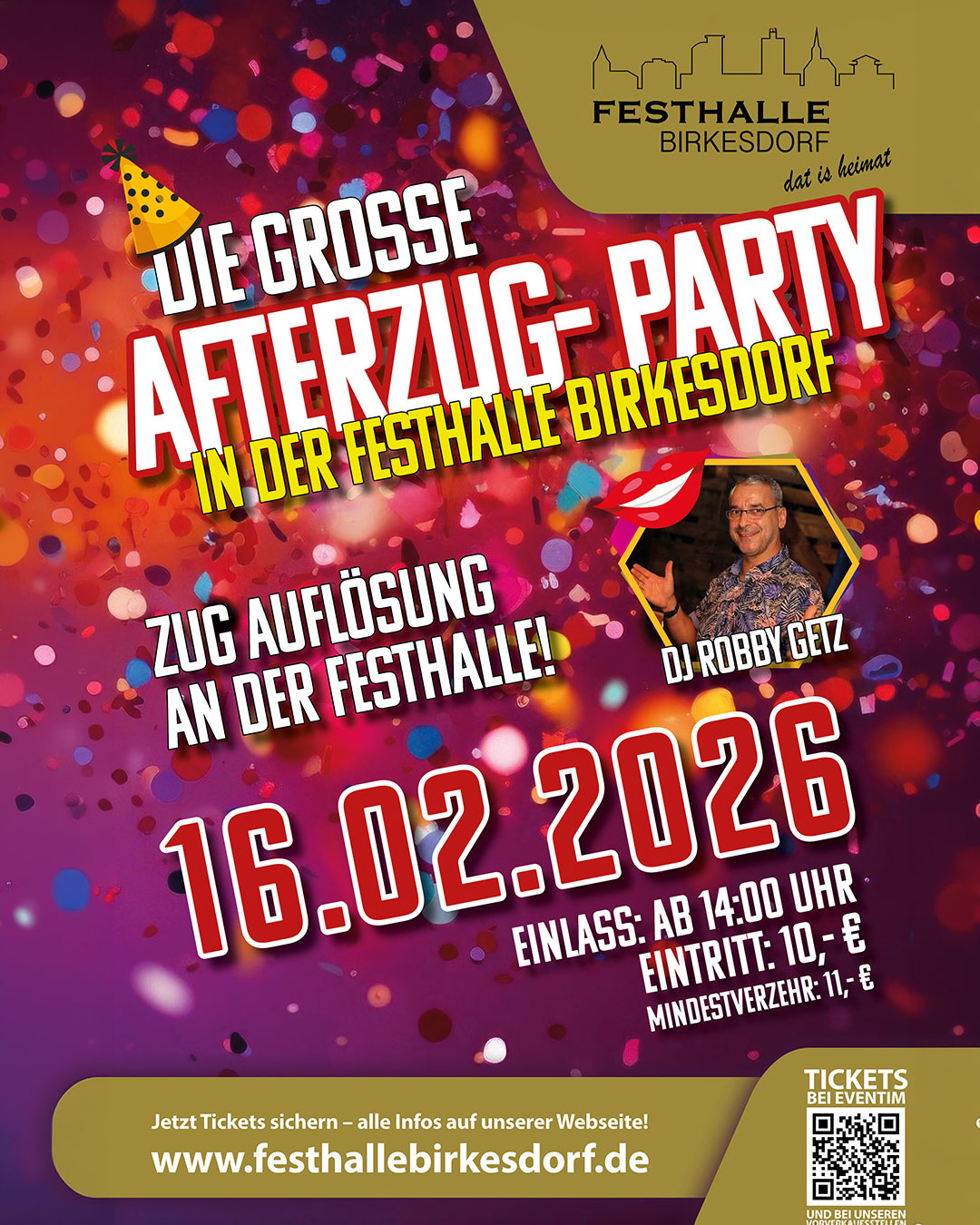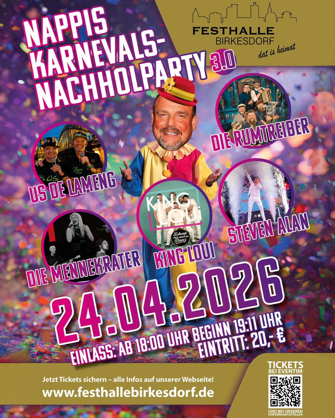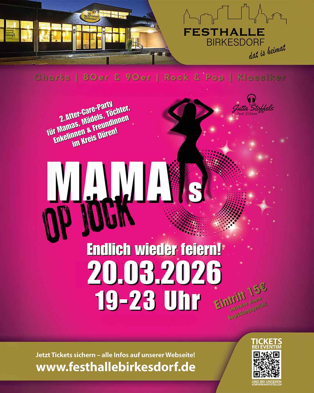 DownloadGroße Weiberfastnacht PartyDonnerstag, 12.02.2026Einlass: ab 12:00 Uhr Eintritt: 25,- € Bremsklötz Live!!Freitag, 13.02.2026Einlass: 18:30 Uhr | Beginn: 20:11 Uhr Download DownloadKarnevalssamstag PartySamstag, 14.02.2026Eintritt: 20,- € Afterzug-PartyMontag, 16.02.2026Einlass: ab 14:00 Uhr Download DownloadAschermittwoch BuffetMittwoch, 18.02.2026All you can eat: 22,90 € Schlager & Discofox PartySamstag, 14.03.2026Beginn: 20:00 Uhr Download DownloadMama's op JöckFreitag, 20.03.2026 Karnevals-Nachholparty 3.0Freitag, 24.04.2026 Download DownloadMuttertags-SektbrunchSonntag, 10.05.2026VorverkaufsstellenFesthalle BirkesdorfAn der Festhalle 3, 52353 DürenRainer´s FrisiereckeRingstraße 3, 52353 BirkesdorfTabak RichterParadiesplatz 1, 52349 Düren